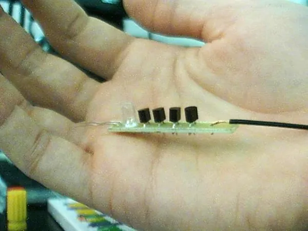 With our simple circuit, four PNP transistors, one LED, one resistor, a wire as an antenna, and a battery, we constructed our sensors sans circuit board. The tiny structures resembled little bugs, and we began to think of them as having unique personalities, for their behavior was never the same. Here is a more complete write up of this stage of the project.
