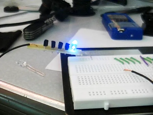 We were using Arduino for the GSR necklace, but I was convinced that the capacitance effect had nothing to do with the code we wrote (which measured resistance), and should be able to be reproduced using analog components only. At the time I had a limited knowledge of analog electronics, but I understood that I would need some way of taking single input (antenna) and using it to control the flow of electricity to an LED. This meant I needed to use a transistor. A single transistor was not sensitive enough to amplify the faint tug of the electrons on our bodies, but several transistors can be wired together, each amplifying the output of the previous. By experimenting with the number of transistors, I found that four was the right balance of reactivity and sensitivity.